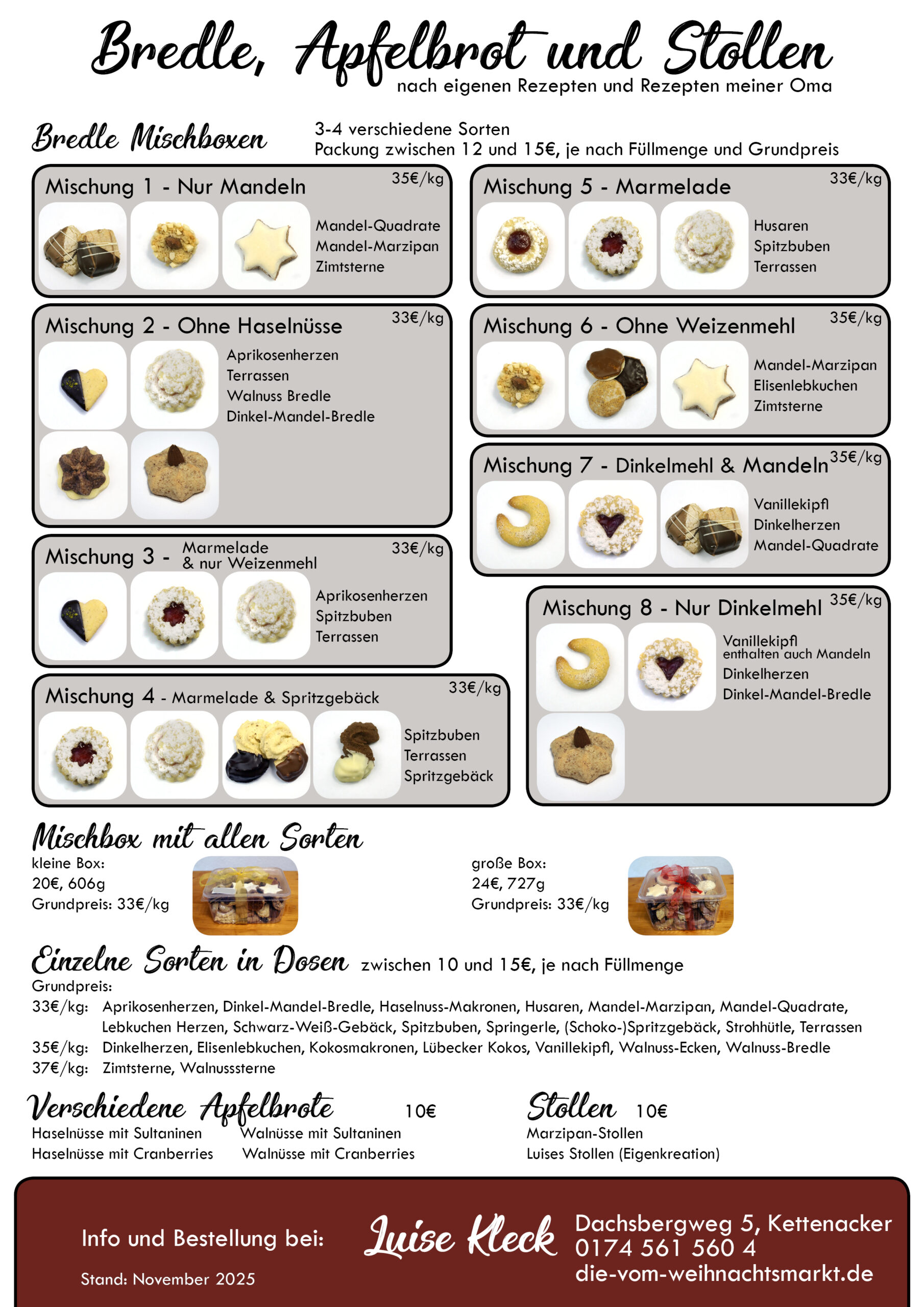 Natürlich backe ich auch 2025 fleißig. Gerne nehme ich eure Bestellungen für Apfelbrot, Stollen und Bredle ab sofort auf.